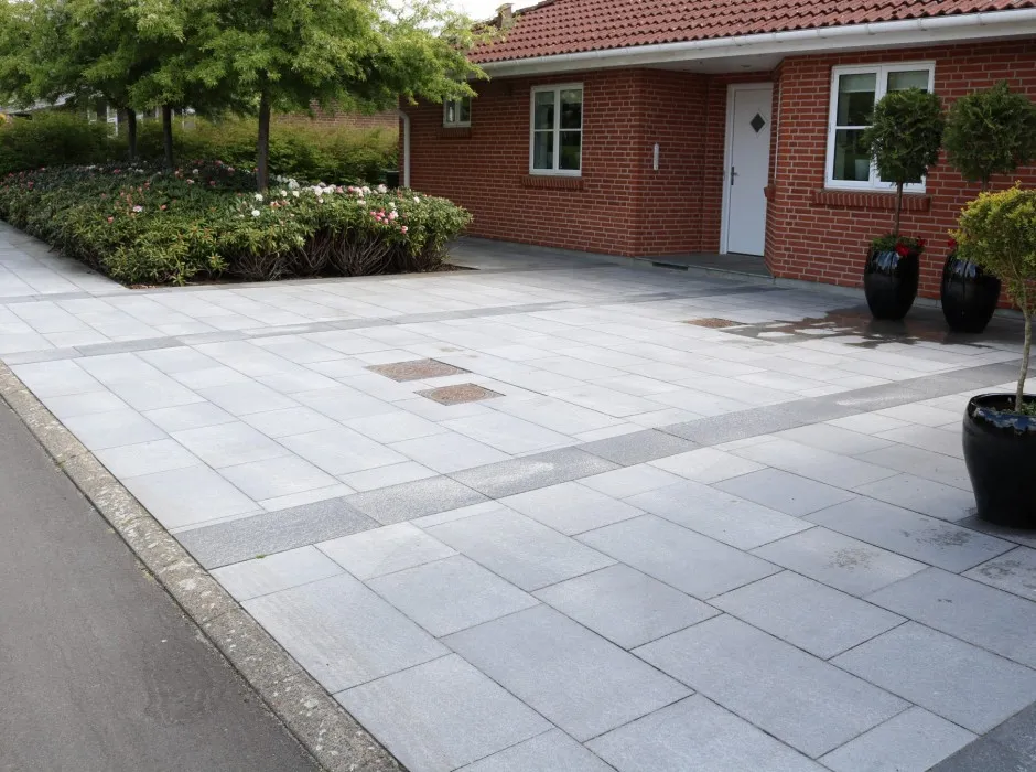 Vi har anvendt et stærkt betonprodukt, med en helt særlig lukket overflade, den er b.la. godkendt i Tyskland, til brug i alle offentlige rum, grundet produktets langtidsholdbare egenskaber.